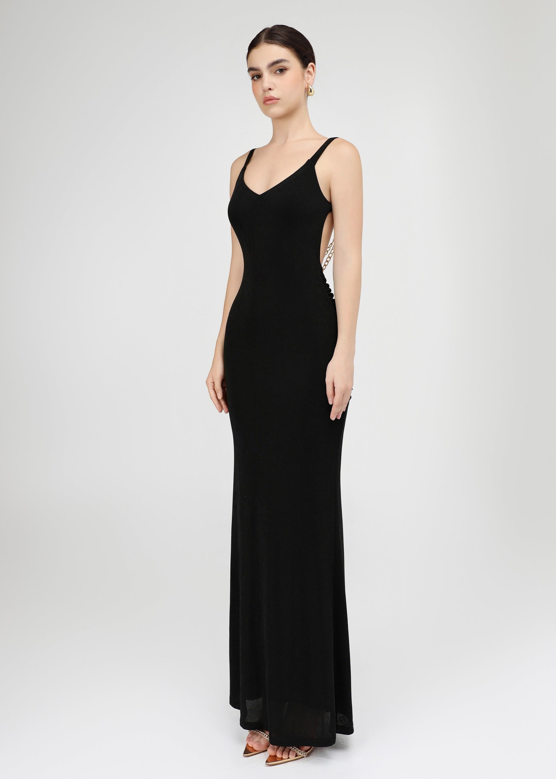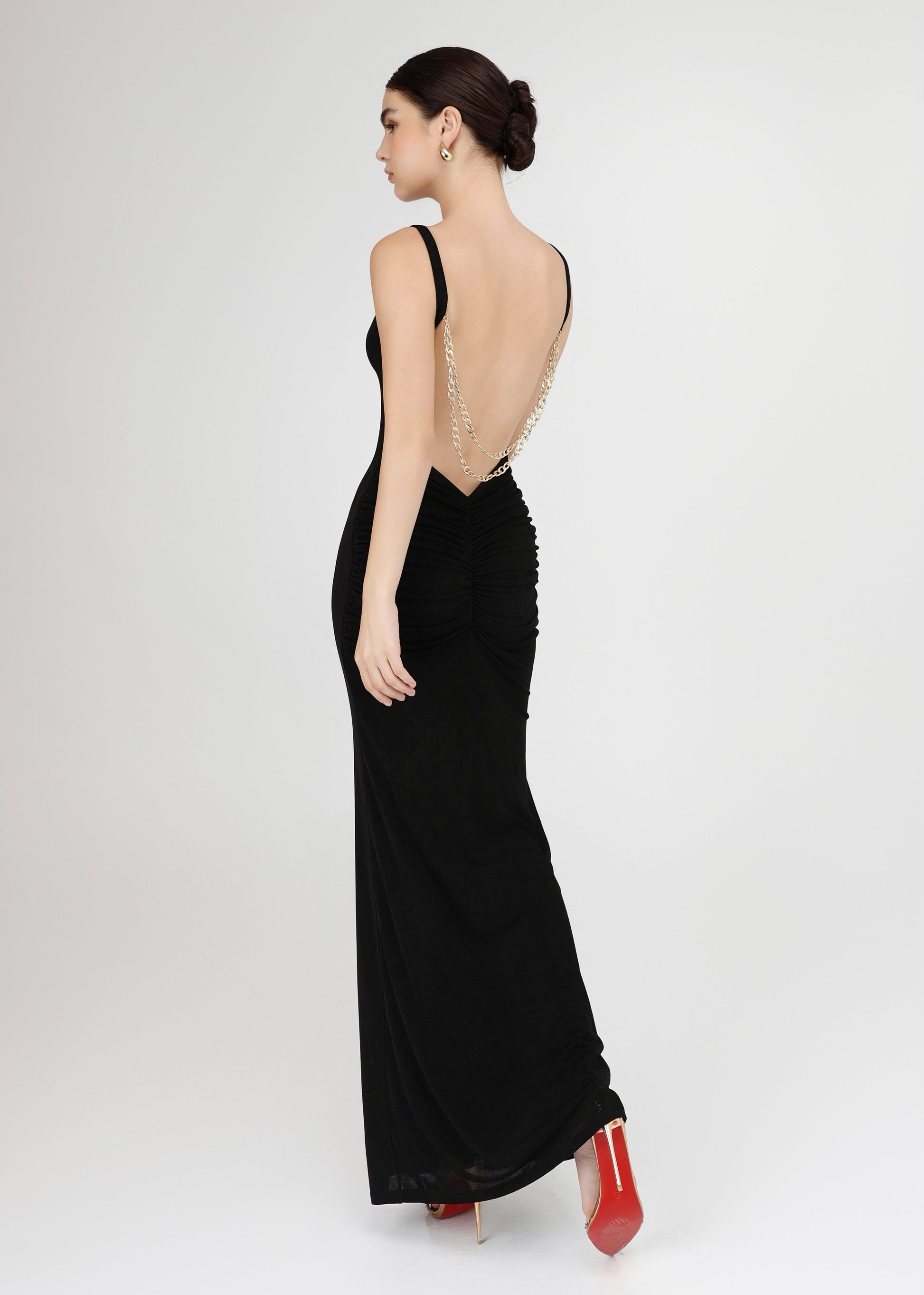 The Mystic Dress - Glamorous Black Dress with Cascading Gold Chains and Open Back